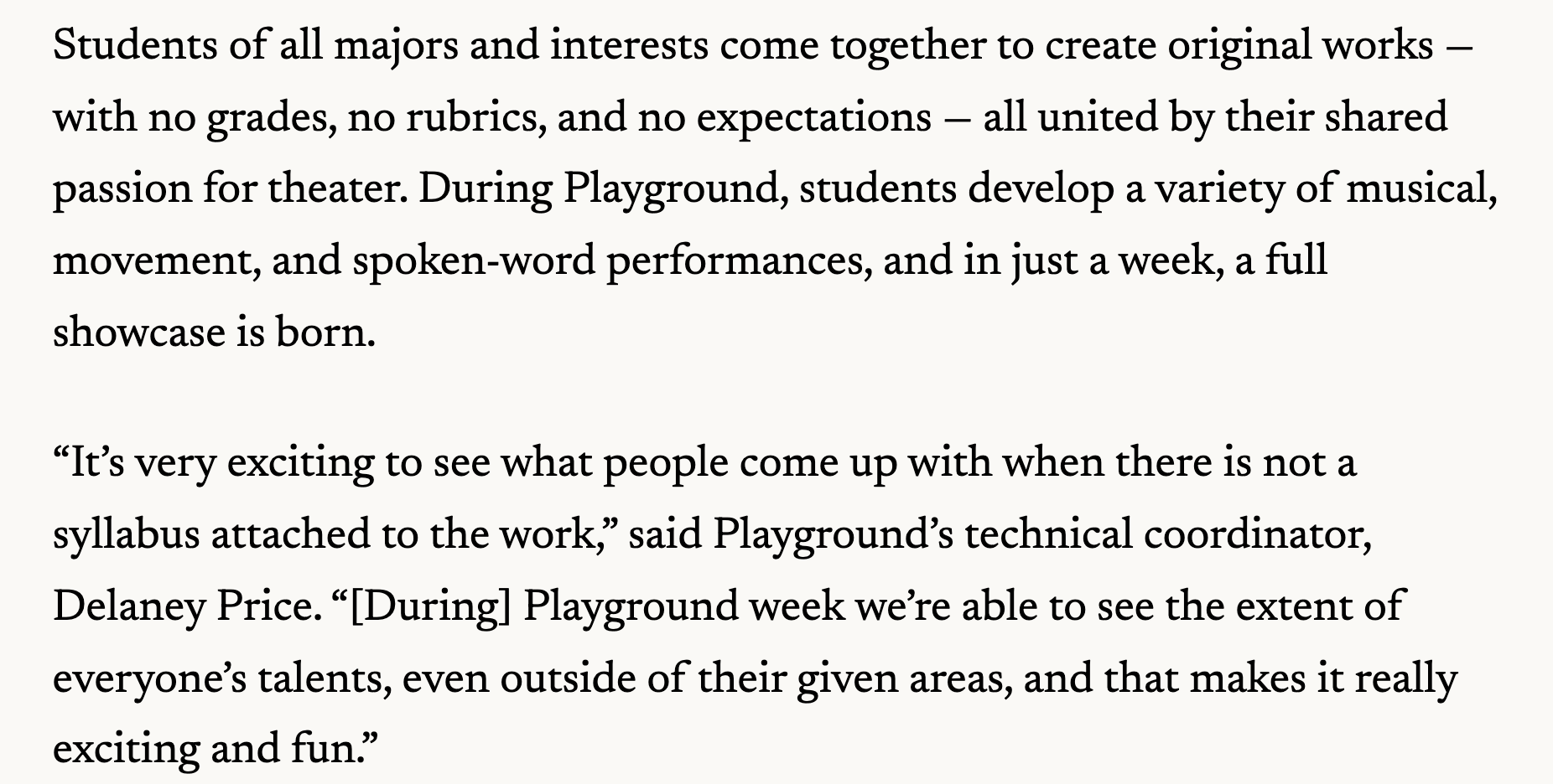 A volunteer position, Playground is a labor of love outside of course requirements that allows the Carnegie Mellon University one week each week to take over the build and produce new work!